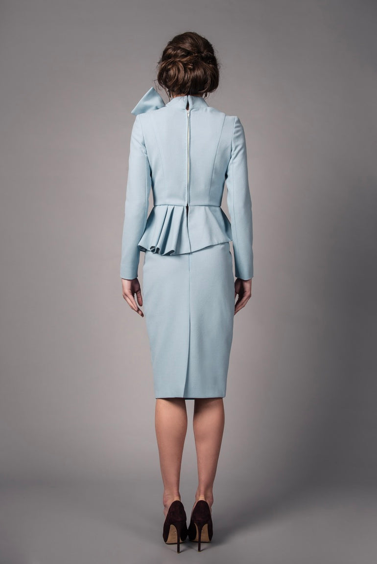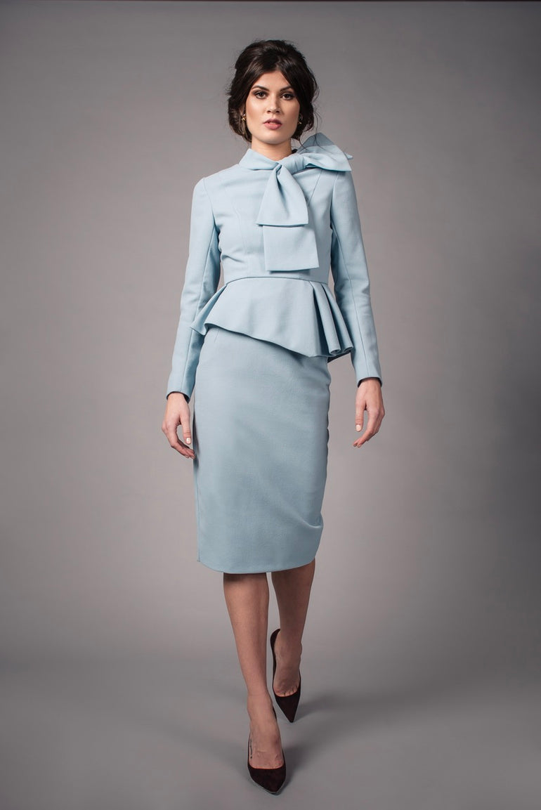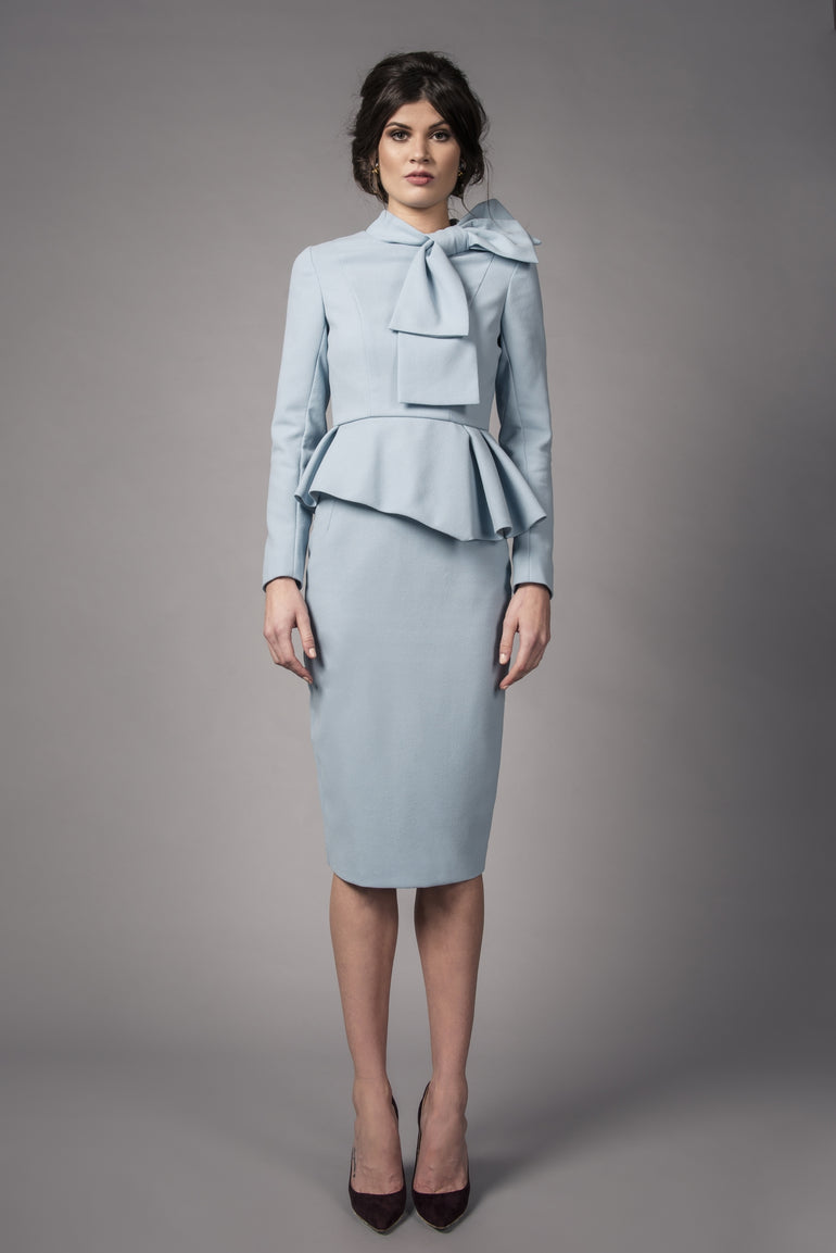 This Italian wool crepe suit in the softest shade of duck egg is a combination of elegance and style. A classic pencilled skirt to compliment the peplum jacket, finished with a double statement bow. We love how this exudes grace and sophistication. Easily styled and perfect to mix and match, pair the pencil skirt with a chiffon blouse or the jacket with your favourite jeans, its made for versatility.
