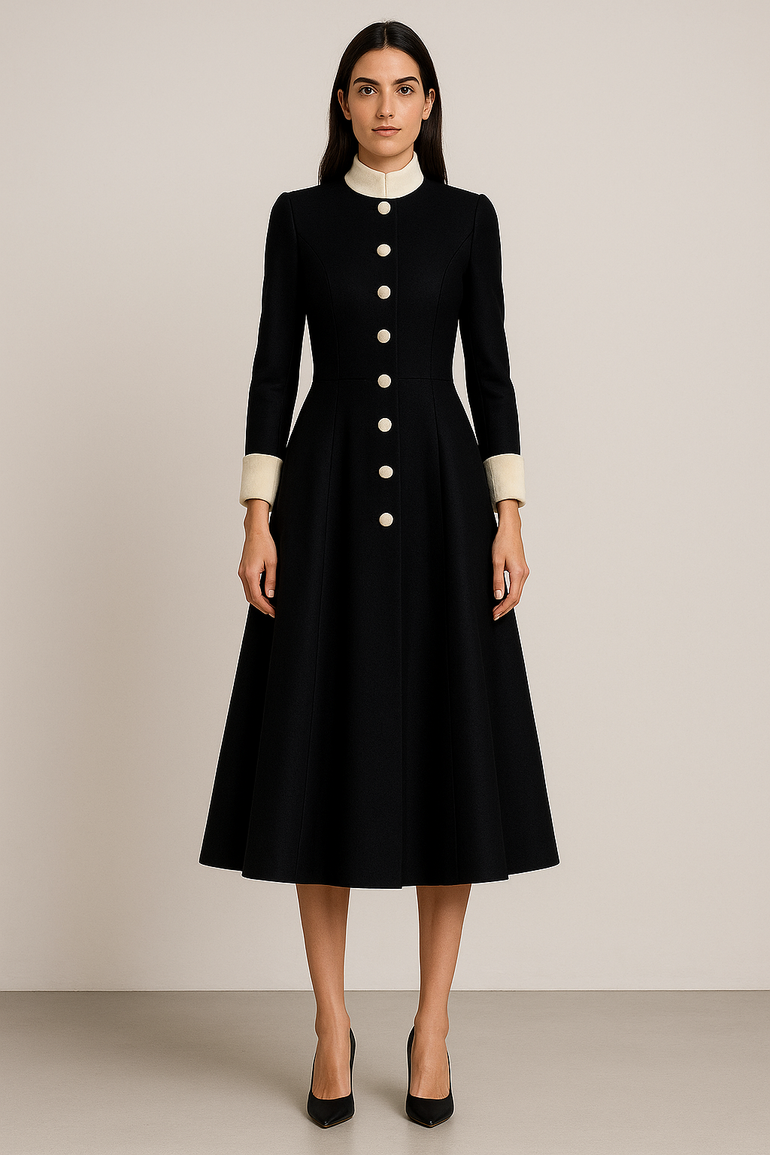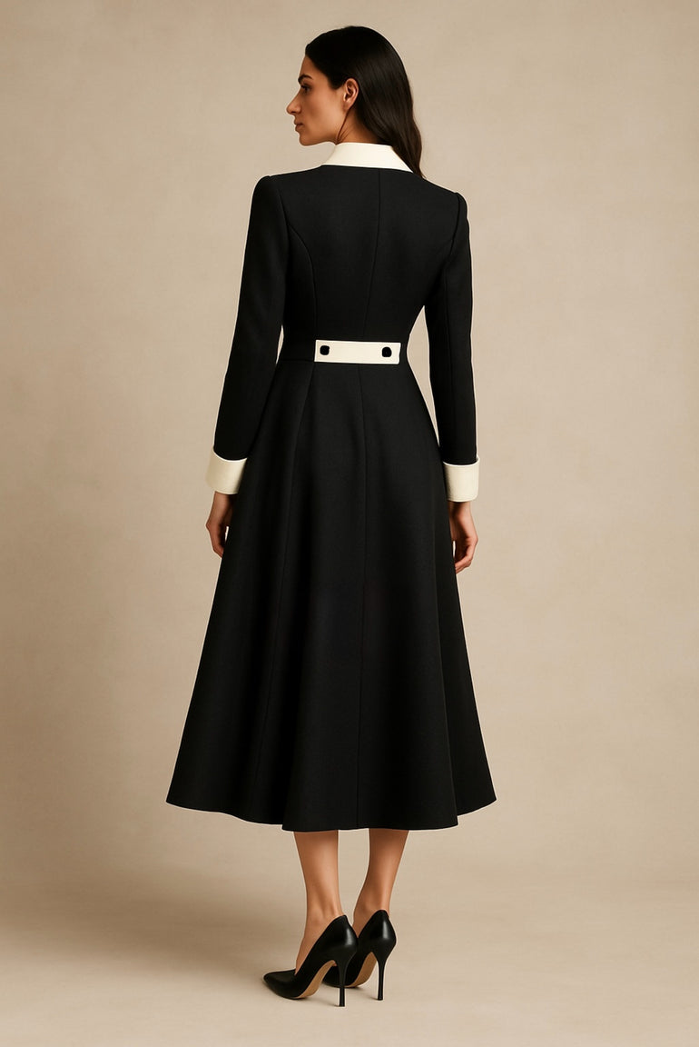 The Kirsten coat dress, with full skirt and fitted full length sleeves, is the ultimate in elegant chic!