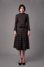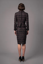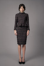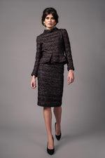 This tweed suit whilst mainly classic in style, has a touch of sparkle and fun in the form of multi-coloured threads channelling through the fabric.